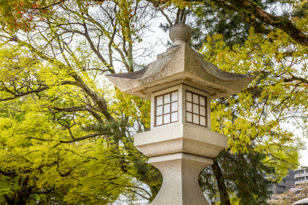 Stone lantern in the Japanese garden with yellow leaves on the background.