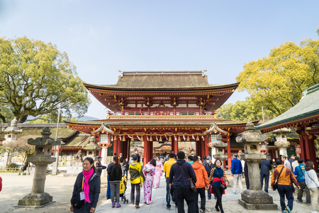 Fukuoka, Japan - March 19, 2016: Fukuoke on March 19, 2016. A large group of Chinese tourists are walking in to Dazaifu Shrine.