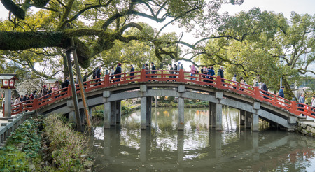 Fukuoka, Japan - March 19, 2016: Fukuoka on March 19. Tourists are walking crossing the Red bridge of Dazaifu Shrine.