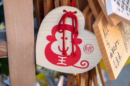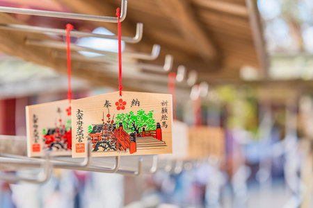 kyushu, japan - march 13 2022: Japanese wooden Ema plaques decorated with a drawing of the red Taiko Bashi bridge of Dazaifu shinto Shrine and adorned with a coat of arms depicting a plum blossom.