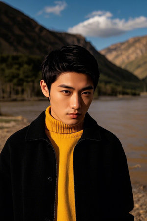 Portrait of young handsome asian man in yellow winter jacket outdoor