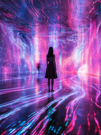 People exploring interactive digital art exhibition with vibrant lights and reflections creating immersive atmosphere