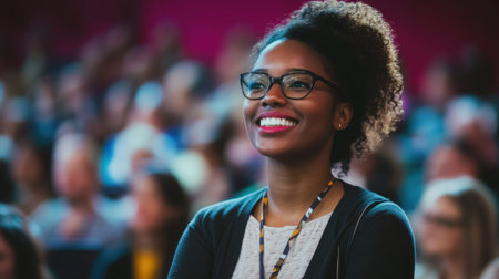 In a seminar hall filled with applause, a black woman stands out, radiating enthusiasm and active participation, symbolizing empowerment and unity