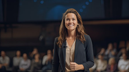 Beautiful businesswoman standing in front of a stage during a conference