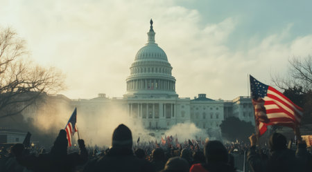 A powerful display of patriotism as a large group of people raise American flags in front of a majestic building