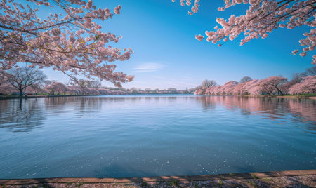 The lake in full bloom during the springtime, cherry tries to blossoms near the lake in clear sunny day