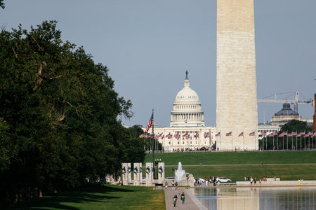Washington, District of Columbia, United States of America - Washington monument park, obelisk on national mall, American flags and US capitol