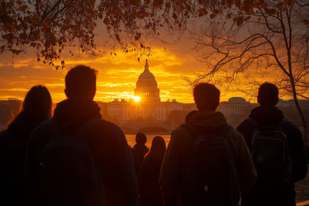 At dawn, a group of people stands silhouetted against the vibrant sunrise, observing the inauguration of a prominent building. The atmosphere is filled with anticipation and excitement as day breaks.