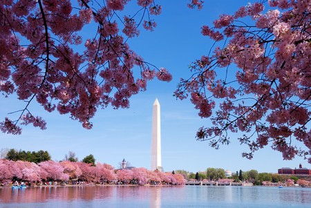 Overcast view of the Washington Monument with cherry blossom at Washington DC