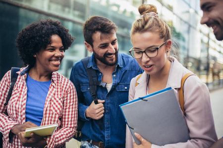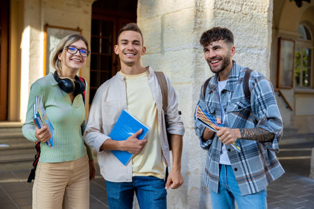 Diverse group of cheerful students smiling brightly while holding colorful notebooks and preparing for an exciting day of learning together at university campus in the lovely afternoon sunshine