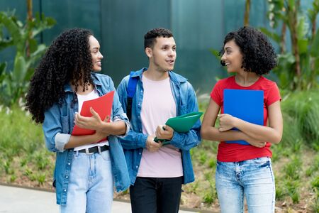 Friends, group and walking to college class, talking and share knowledge on module. People, learners and outside for social project discussion, speaking and together for trip to university lesson
