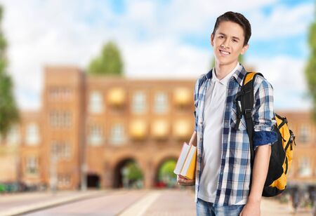 A positive student photographed against the background of the university. A stylish young man doing a sephi on college campus. Student life. Posing student.