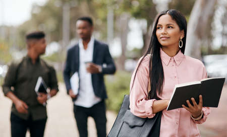Nothing gives you a head start like self confidence. Shot of a young businesswoman going through her notebook while walking through the city.