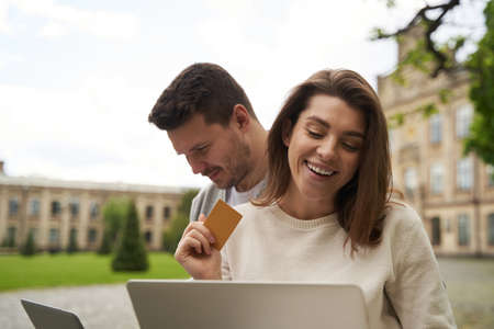 Happy couple using laptops for online shopping on the street