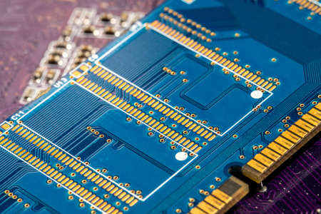Electronic Board RAM with the lines and chips, semiconductor elements close up. The concept of the technology of solid-state microelectronics