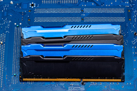 Random Access Memory or RAM for personal computer blue color on dark wooden background.