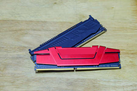 Random Access Memory or RAM for personal computer red color on dark wooden background.