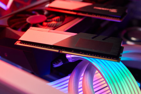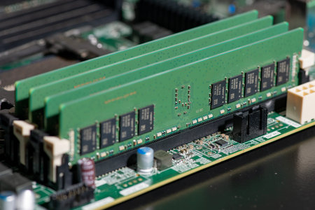 Enhancing Performance: Close-up of Modern Computer Motherboard with DDR5 RAM DIMM Slots