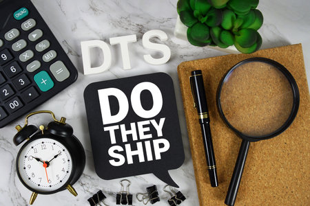 DTS Do They Ship text with Calculator, alarm clock and magnifying glass on marble background