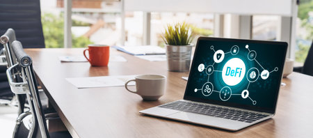 Decentralized finance or DeFi concept on modish computer screen . The defi system give new choice of investment and money saving .