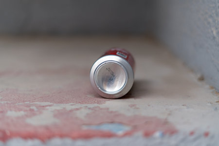 Close up of empty aluminum drink can discarded on dirty ground, urban litter and pollution concept, waste problem and environmental cleanliness issue