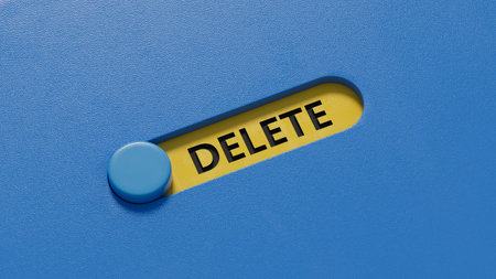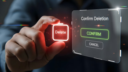 A finger presses a glowing delete button on a futuristic digital interface with confirmation...