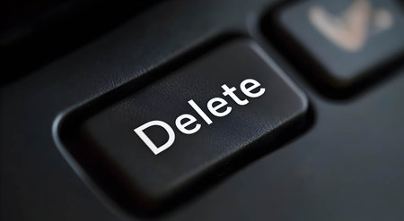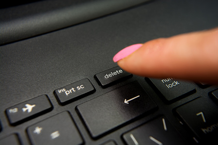 Close-up of a finger pressing the delete key on a computer keyboard during a data management task