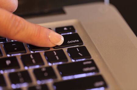 Female finger presses delete button on black laptop, delete, erase, eliminate