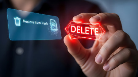A hand holds a glowing delete button next to a restore from trash icon on a digital interface.