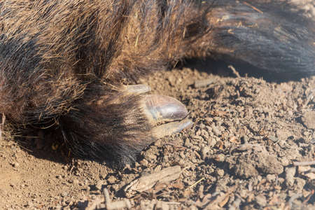 Raised Brown Bear sleep on the concrete ground at Noboribetsu Bear Park in Hokkaido, Japan.