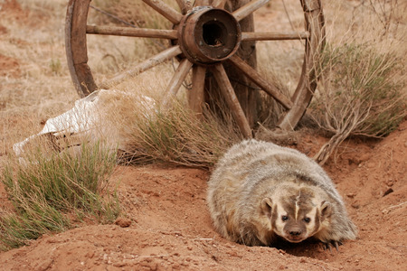 American badger (Taxidea taxus) sitting on the dirt ground