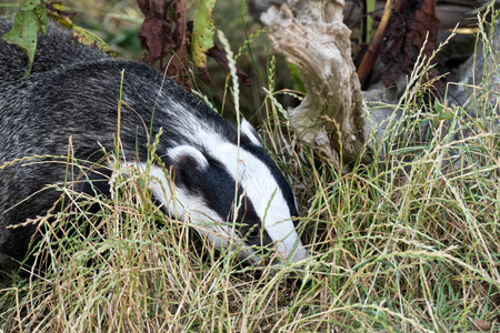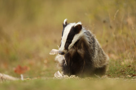 Badger in edge of forest on meadow, animal in nature habitat. Wild Badger, Meles meles. Mammal in environment during late summer day.