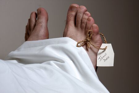 closeup of the feet of a dead body covered with a sheet, with a blank tag tied on the big toe of his left foot, in monochrome, with a vignette added