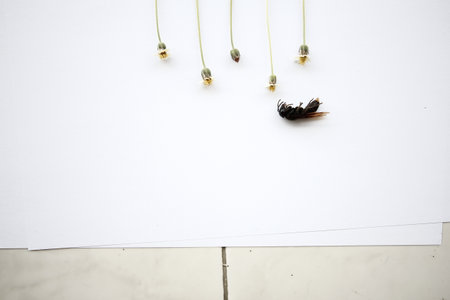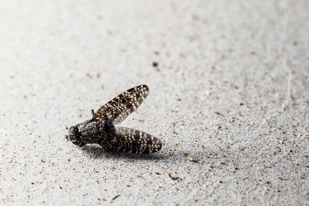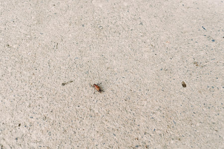 Insect ant dead on concrete floor closeup, small brown bug on textured beige surface, macro detail and shadow with isolated minimalist composition and natural outdoor pavement scene