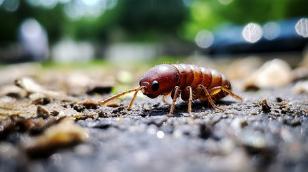 Brown weevil insect crawls on a cement floor surface, showing its textured design. It's a plant-eating pest with six legs and antennae. This macro shot highlights nature's beauty.