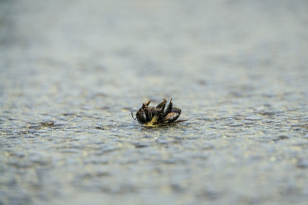 closeup showing a dead bug named Cysolina sturmi supine on pavement in sunny ambiance