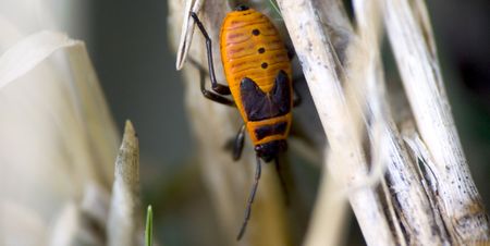 red beetle Pyrrhocoris apterus on a rustic background Firebug on a leaf