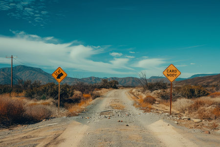 Remote desert road with quirky street signs amidst a scenic landscape