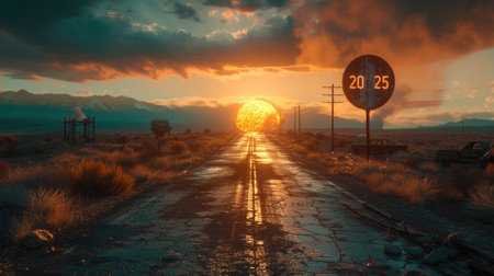 A long, winding road stretches towards the horizon, where the sun bursts forth in a fiery display at dusk, casting a warm, ethereal glow over the countryside landscape. Highway with 92 number