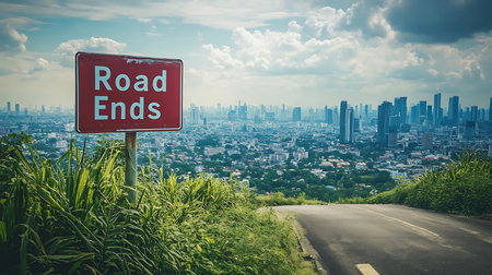 A striking road ends sign overlooking a sprawling cityscape combining nature and urban life.