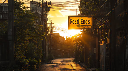 A quiet urban street at sunset ends with a sign capturing a moment of solitude and reflection.