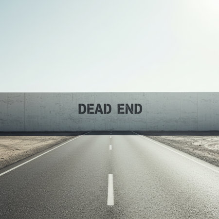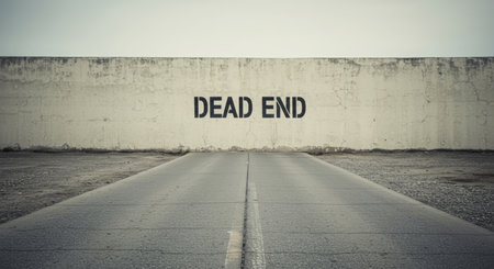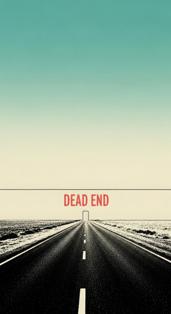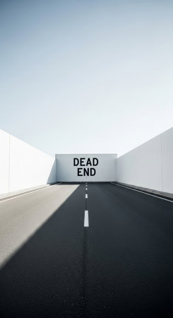 A minimalist concept of a dead end in a quarry: an endless road suddenly comes to a wall with the inscription Dead End, symbolizing hopelessness and the end of the journey.