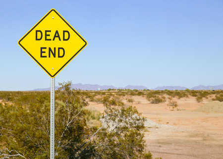 Dead End sign in the Sonoran desert, Arizona, USA, with a mountain range in the back and shrubs growing on arid ground.