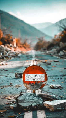 Road blocked by debris with warning sign in foreground, post-earthquake scenario. Evacuation and disaster preparedness focus.