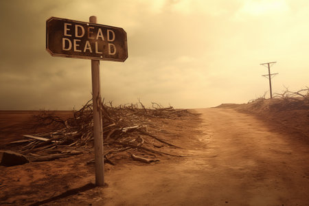 Rusty dead end sign beside a long, straight, deserted road through dry landscape, suggesting a concept of lost opportunity or no way out