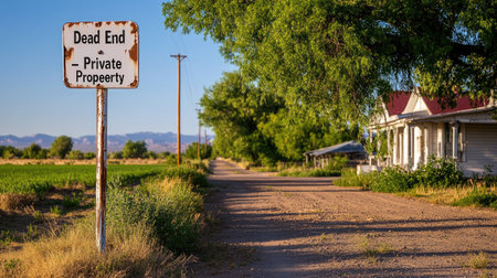 A beautiful rural scene featuring a dead end sign, nestled among lush greenery, wooden fences, and a tranquil dirt path. Perfect for evoking peace.
