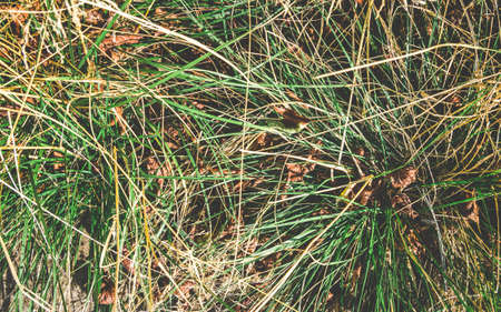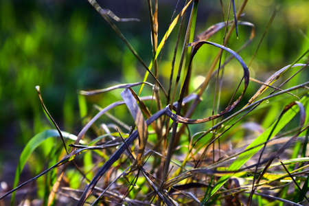 Close up of tall green and dry grass and leaves. Abstract background