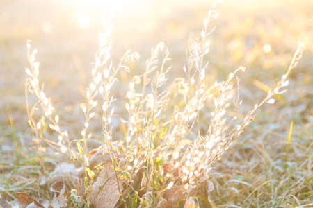 closeup view of frozen grass with backlit sun in the beginning of spring