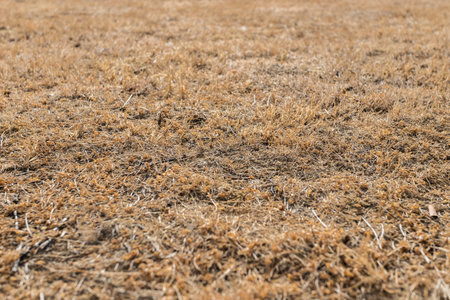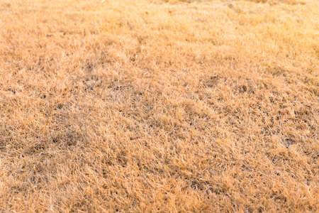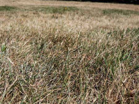 Yellow, completely dried out grass and lawn exposed to full sun, hot weather and lack of rain after prolunged heat in summer