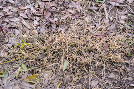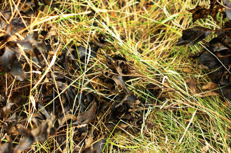 Texture of herbs and dried oak leaves fallen on the ground